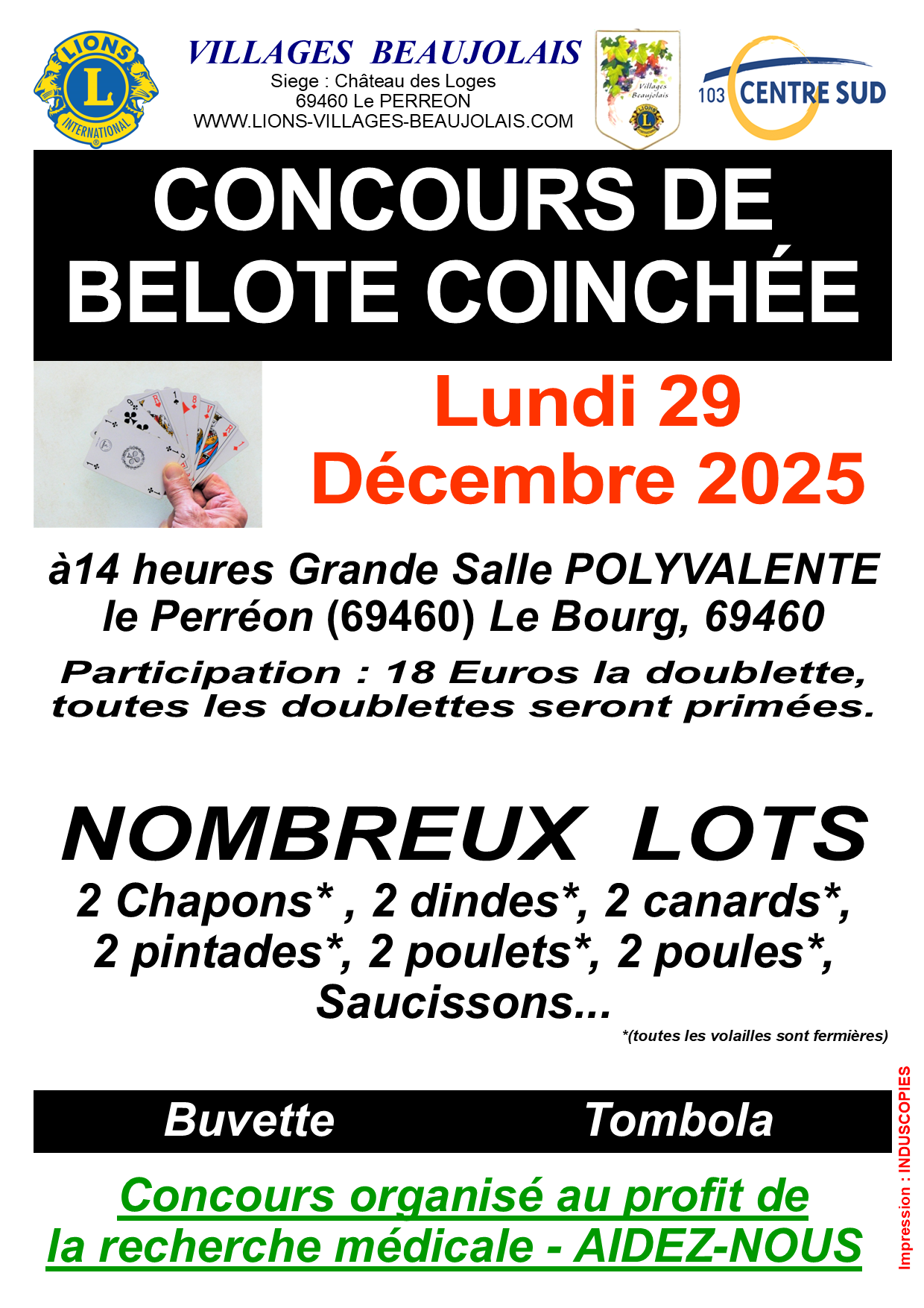Notre concours annuel de BELOTE COINCHÉ du jeudi 29 décembre 2025, a partir de 14h au profit de la recherche médicale, nous vous attendons nombreux pour notre action en faveur de la recherche médicale.