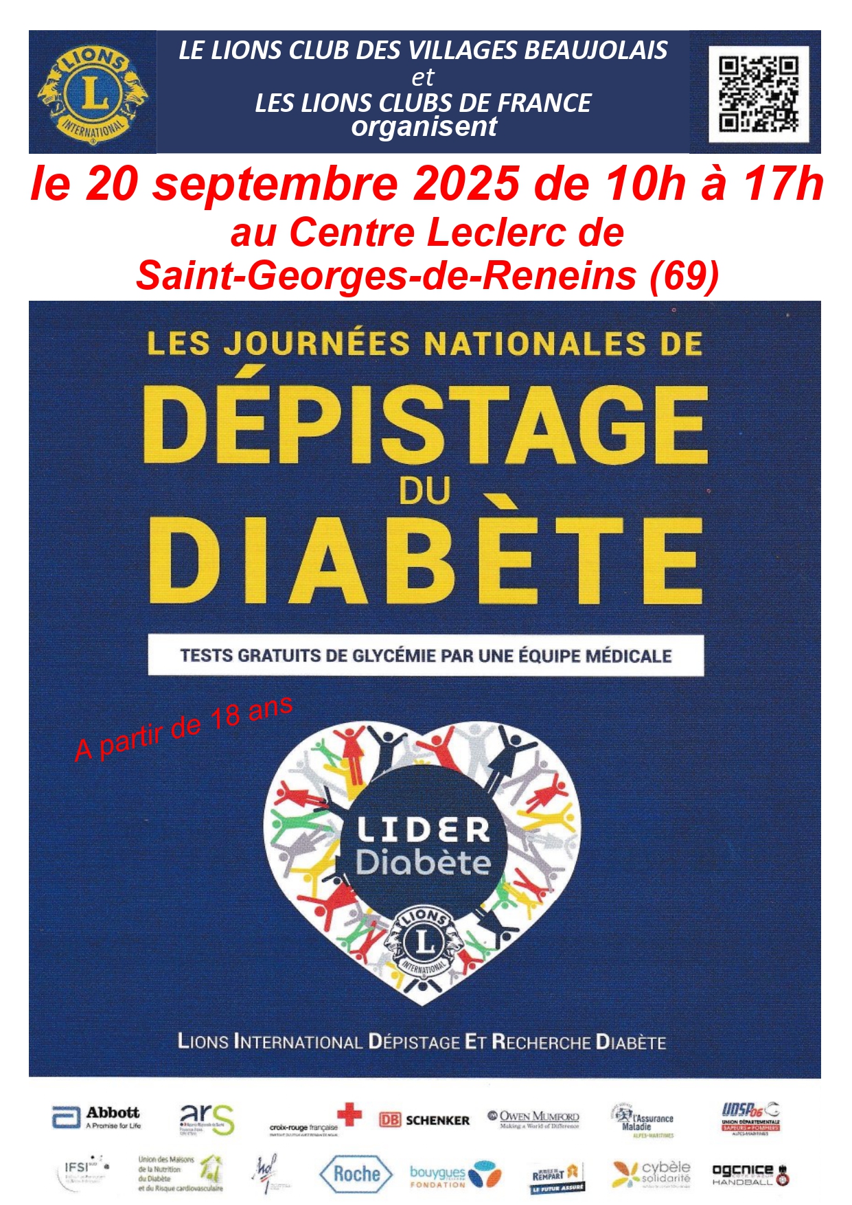 En collaboration avec la cellule LIONS FRANCE dépistage diabète, l’accueil du Centre Leclerc de Saint Georges de Reneins et des bénévoles médecins et infirmières, notre club a organisé une journée sensibilisation et dépistage du diabète.